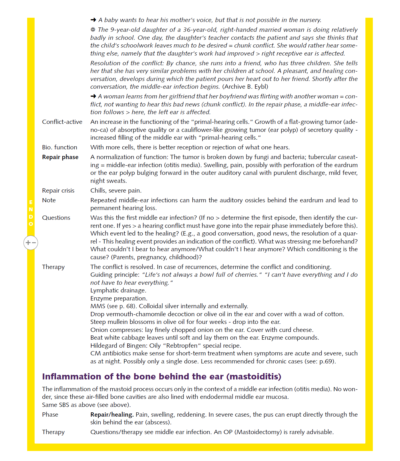 2020/01/20 ![]() ![]() ![]() ![]() 10 years ago, the now 35-year-old had a boss who bullied his employees wherever he could. There she reacted with the SBS of the mucous membrane of the Eustachian tube on the left, so she had to "listen to get rid of the danger/the predator/...", which happened daily at work at that time. Years later, when this one suddenly surprised her by phone and wanted to hire her again, she made it clear that she will NEVER work for him again and she never wants to hear him again, which led to the resolution of this old massive conflict. The now following 3 weeks duration of the severe symptoms could be accurately predicted. | ||||||
