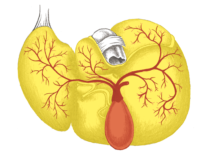 The liver (hepar) is the largest internal organ of the human body. It is the central organ for metabolism and the “chemical laboratory.“ Venous blood enters the liver through the portal vein carrying nutrients from the intestines and through worn-out blood cells from the spleen. The primal, endodermal tissue of the liver (liver parenchyma) serves to take up nutrition (absorptive function) and produce bile (secretory function). Some of the bile ducts lie within the liver (intrahepatic), while others lie outside the liver (extrahepatic). The bile flows through the bile ducts over the dead-end-like gallbladder into the duodenum. The bile ducts and gallbladder are muscular tubes lined with ectodermal squamous epithelium. The liver is regarded as the bodily organ that is most capable of regenerating.