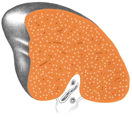 The fist-sized spleen lies on the left side of the body underneath the diaphragm. For a long time, the spleen’s function was not understood, as its removal seemed to have no physical effects worth mentioning. Today, we know its main purpose: the removal of old or damaged blood cells (via filtering and “devouring“ = phagocytosis) as well as the storage of blood cells, especially thrombocytes for bleeding emergencies.