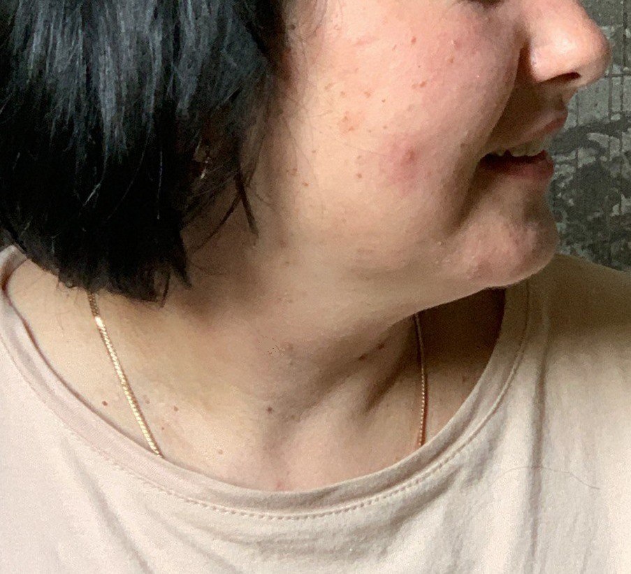 Die Symptome auf dem 1. Foto sind schon nicht mehr so auffällig wie sie zuvor waren, weil das Gespräch mit der Frau schon vorher war. Und es ist mir nicht in den Sinn gekommen, vor dem Gespräch ein Foto zu machen.